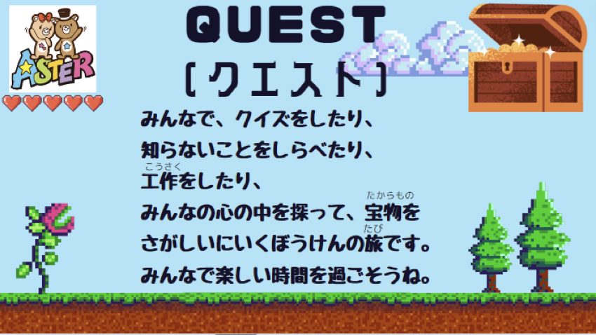 ASTERのプログラミングコース受講者対象に探求学習「QUEST」(クエスト)が始まりました。プログラミング思考を主軸として、歴史、アート、工作、哲学、サイエンス等幅広い分野と掛け合わせながら、様々なクイズや、課題に挑戦してもらい、問題解決能力や、論理的思考を養います。